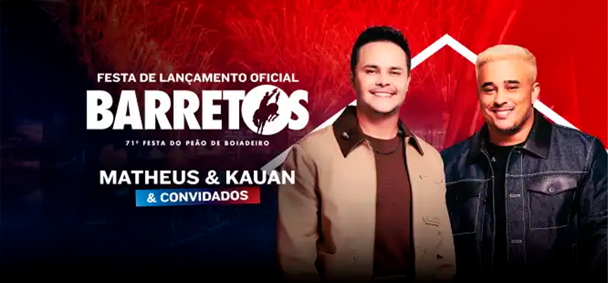 A noite contará com show da dupla Matheus & Kauan. No repertório, sucessos que marcaram a carreira dos artistas, como “Que Sorte a Nossa”, “Admita”, “Deus Perdoa”, “O Nosso Santo Bateu”, “Ao Vivo e a Cores” e “Te Assumi Pro Brasil”, além de músicas mais recentes, como “Ilusão de Ótica”, gravada com Ana Castela.