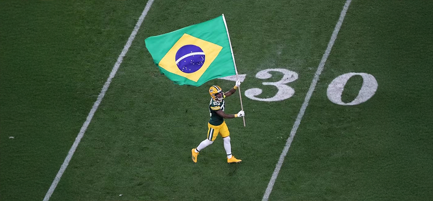 Crédito: NFL Brasil – Jaire Alexander, dos Packers, entra em campo com a bandeira do Brasil — Foto: Wagner Meier/Getty Images