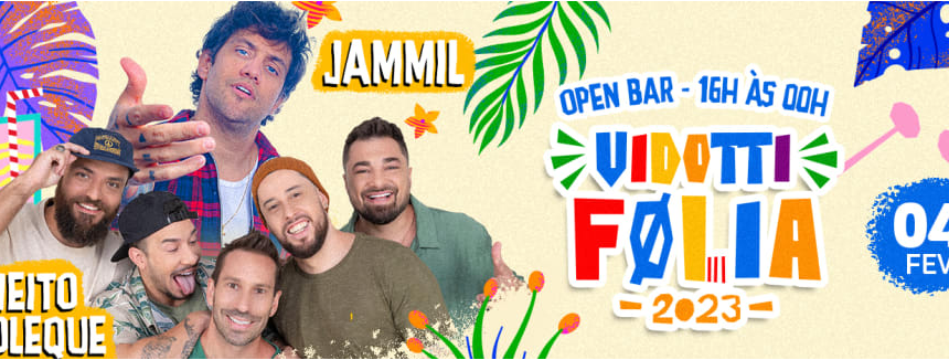 No dia 04 de fevereiro, a partir das 16h, acontece na Fazenda Santa Margarida, na cidade de Campinas, o “Vidotti Folia”. O grupo Jeito Moleque e a banda Jammil prometem agitar o público presente com muita música boa. O ingresso pode ser adquirido pelo site Byma https://byma.com.br/event/63b351648e786800087bfec9 ou na bilheteria do local. O ingresso dá direito ao setor open bar de cerveja, gin, vodka, whisky, tequila, energético, água e refrigerante, das 16h às 00h.